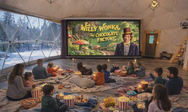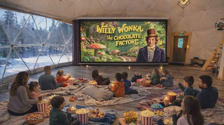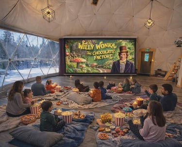 Join us for a cozy, magical Movie Night in the Dome featuring Willy Wonka and the Chocolate Factory. Curl up in your comfiest pajamas with blankets and pillows for a heartwarming family experience. Includes popcorn and hot chocolate for everyone.